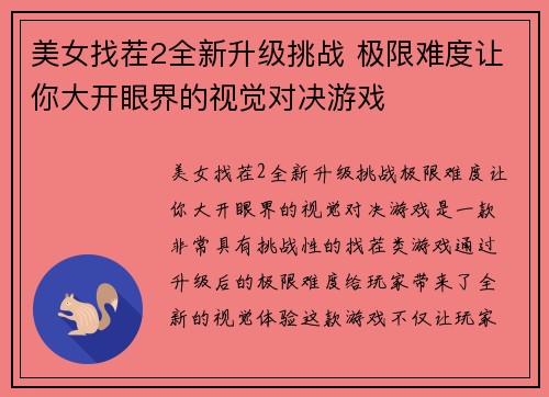 《美女找茬2全新升级挑战 极限难度让你大开眼界的视觉对决游戏》是一款非常具有挑战性的找茬类游戏,通过升级后的极限难度,给玩家带来了全新的视觉体验。这款游戏不仅让玩家在乐趣中锻炼眼力和细致观察能力,而且凭借其高难度的设计,极大地提升了玩家的游戏参与感和挑战性。从图像的复杂程度到找茬的多样性,每个细节都经过精心设计,旨在考验玩家的专注力和反应速度。本篇文章将详细介绍《美女找茬2》这款游戏的四个主要特点,分别是:游戏的极限难度设计、视觉冲击与挑战性、游戏玩法的多样性和创新,以及玩家的游戏体验与互动感受。通过这四个方面的深入分析,读者能够更好地理解这款游戏的魅力所在。